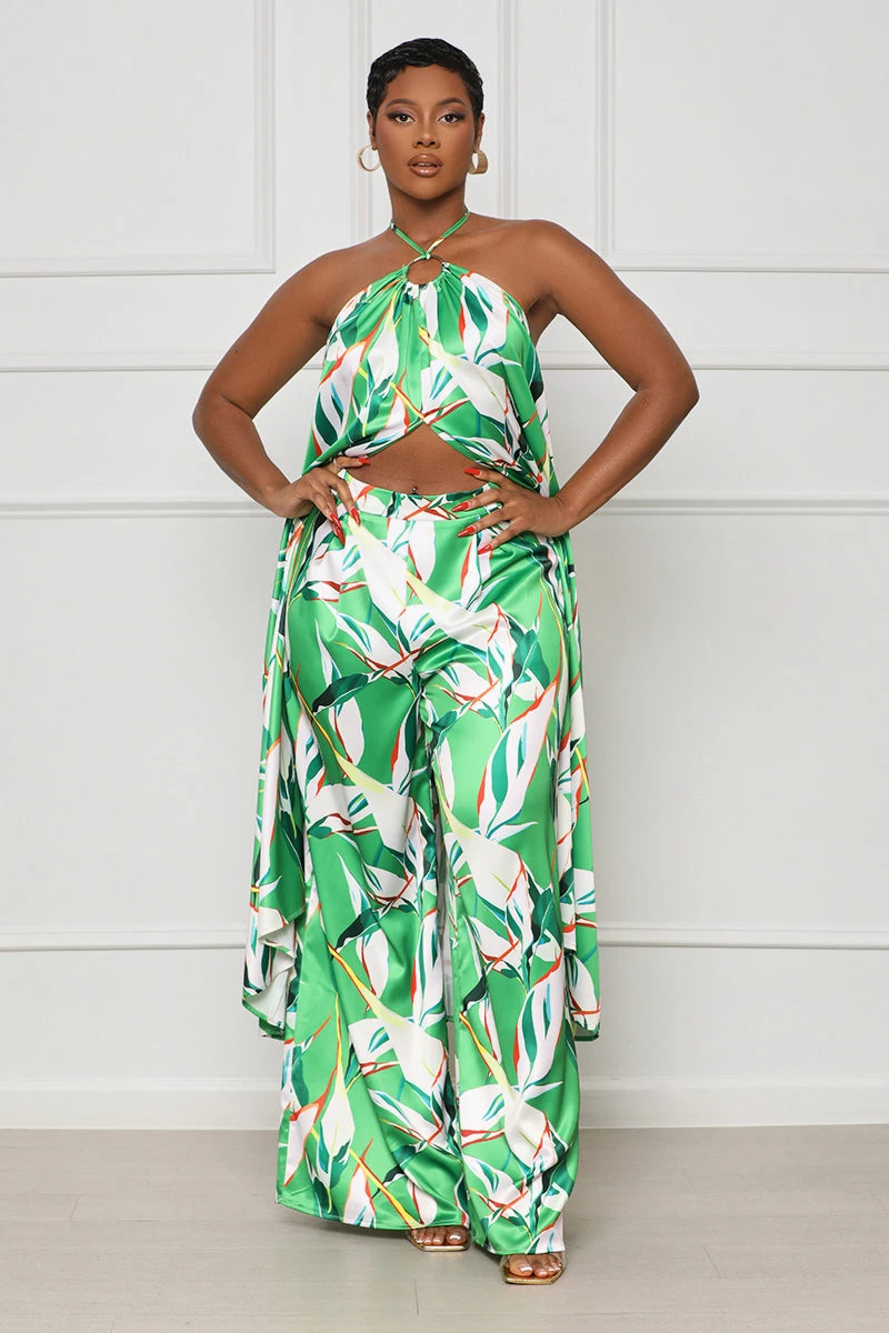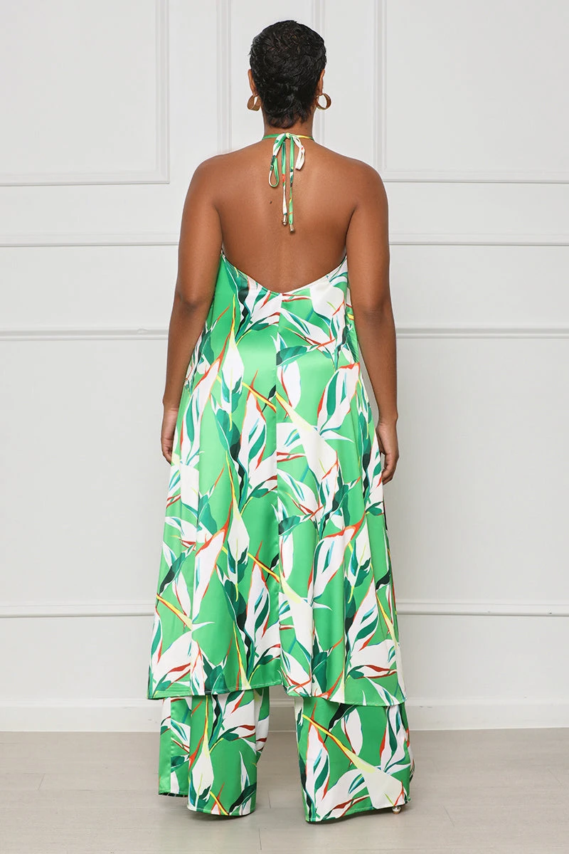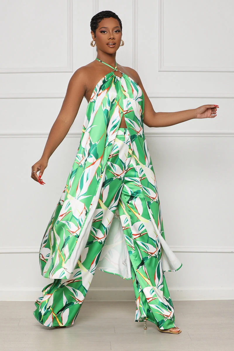 Enjoy the perfect combination of style and comfort with the Tropic Lush Halter Top Pant Set. The stylish halter top cascades down for a chic look, while fun circle detailing adds a touch of flair. The matching pants feature two side pockets and a front zipper closure for ease of use. Plus, the bright, summery print is sure to make you stand out. Complete the look with a straw bag and heels and be the envy of brunch.
