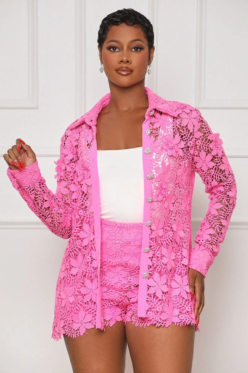 Our Unforgettable You Lace Jeweled Short Set exudes luxury and sophistication. Elegant lace detailing decorates the neckline, while a sprinkle of jewel embellishments enhances the look. The versatile design works with different styling and the matching shorts have an inner lining for maximum comfort. Complete the look with a pair of heels and a stylish bag for an unforgettable evening.