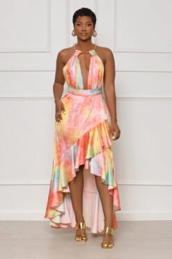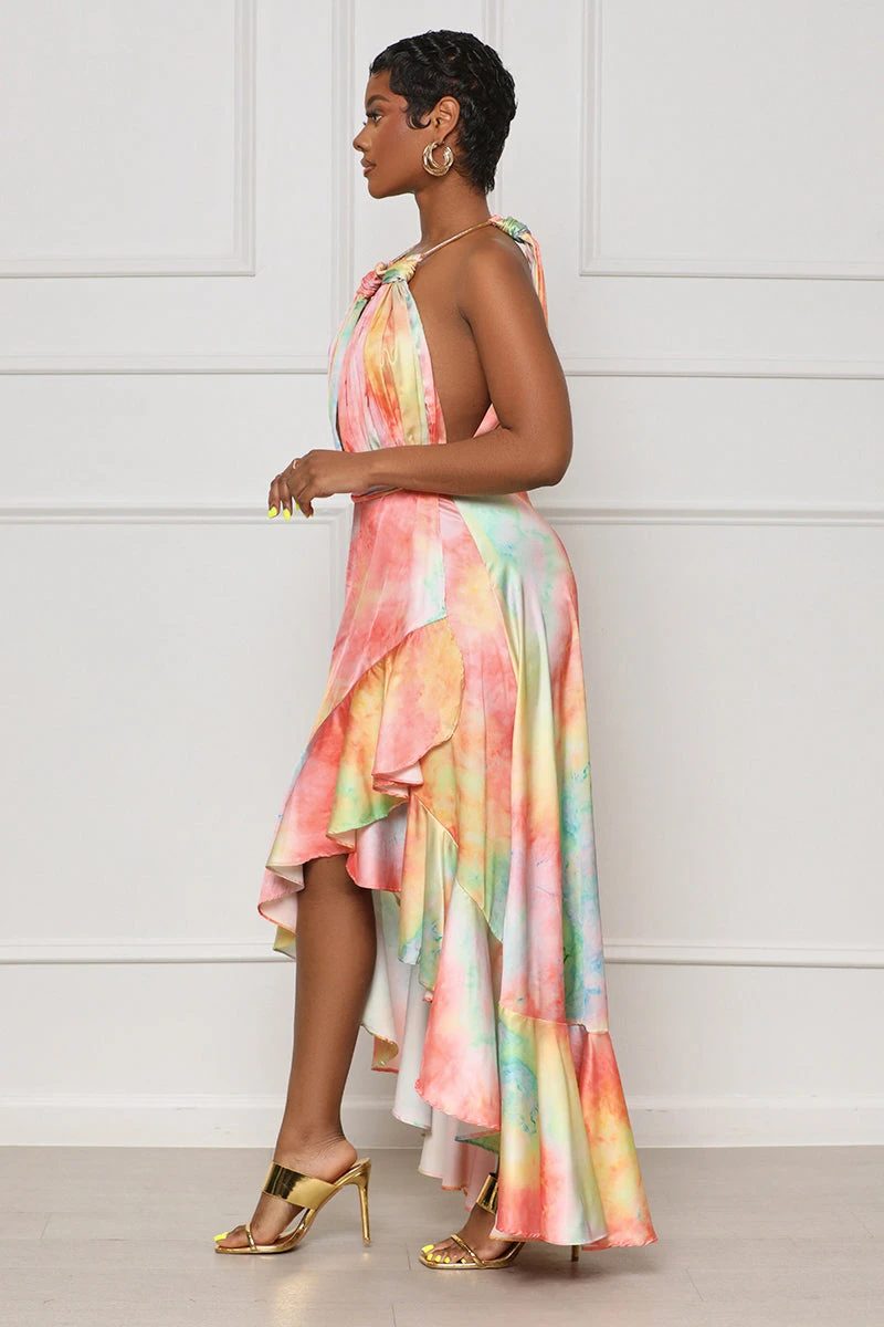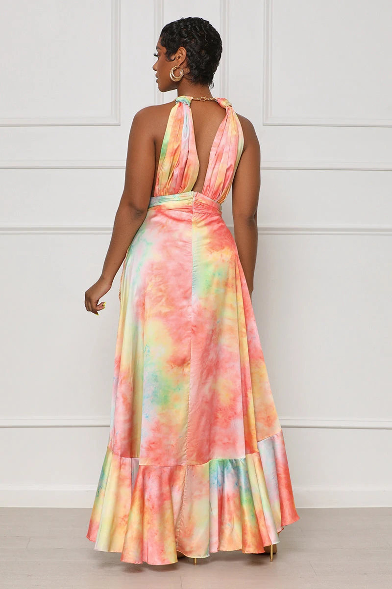 Our Wanderlust Watercolor Ruffled Maxi Dress features a plunging halter neckline that is trimmed in gold hardware. The perfect vacation wardrobe piece, it has a front slit with double lining and a back zipper for easy on and off. This dress pairs well with lace-up heels for a night out on the town or with your favorite sandals for a day at the beach.
