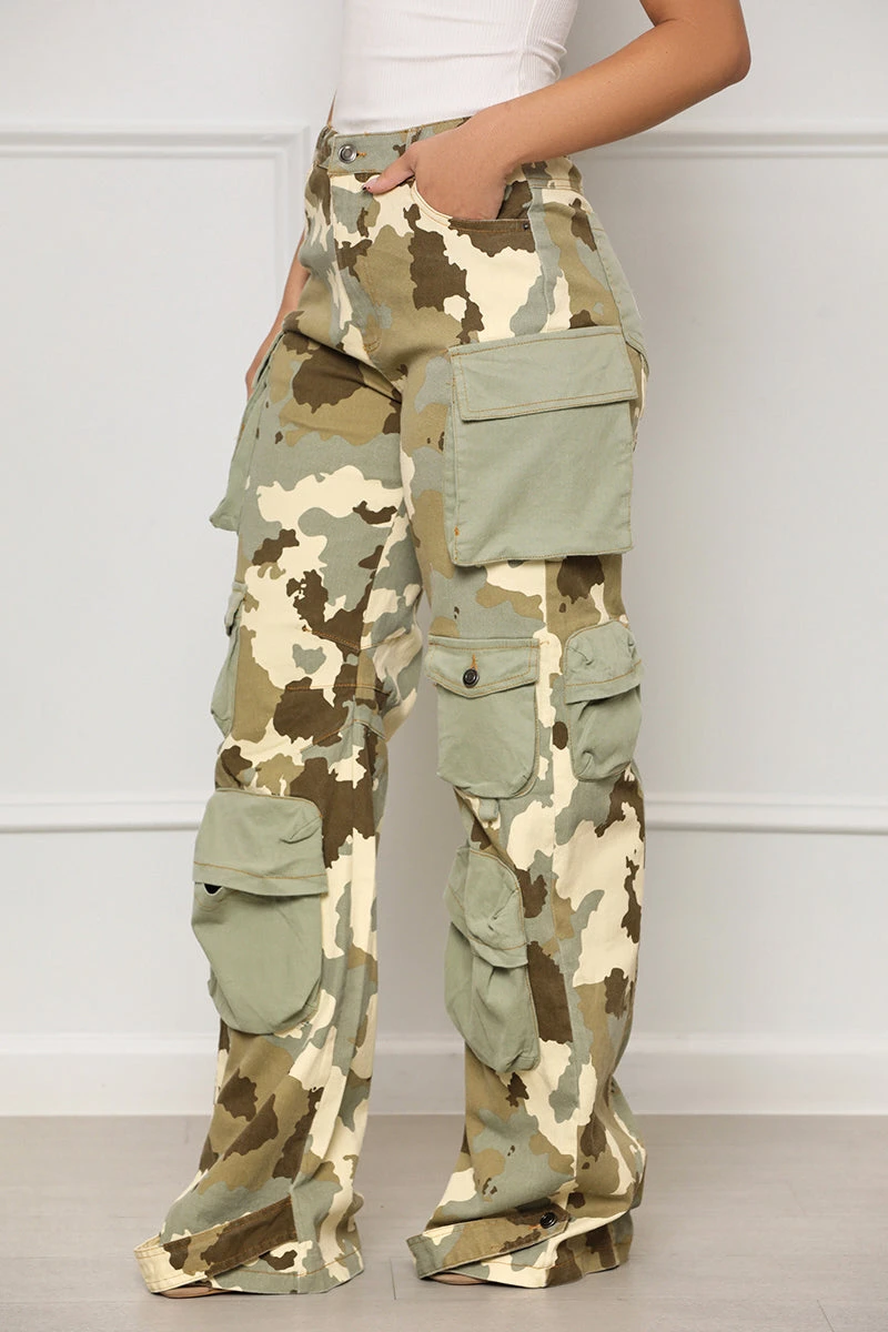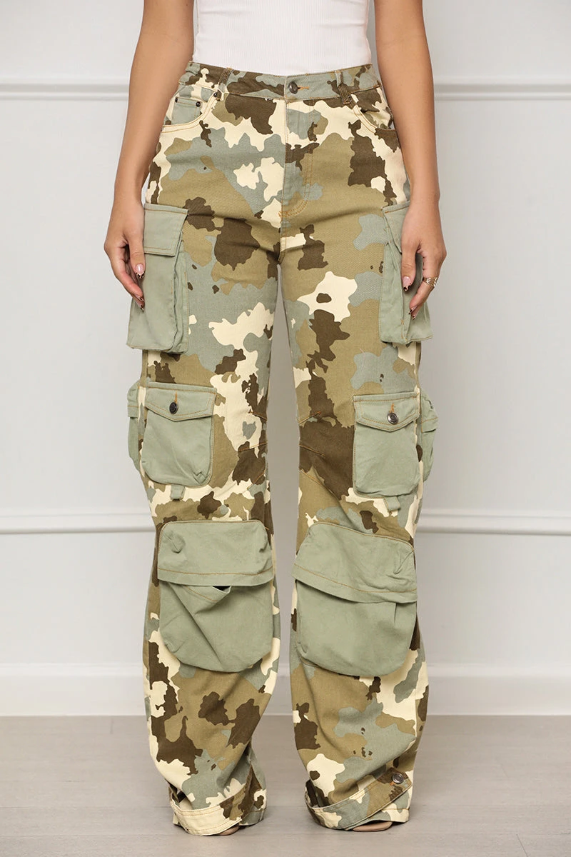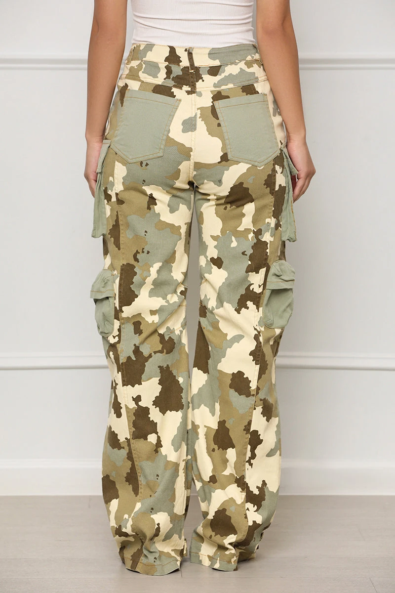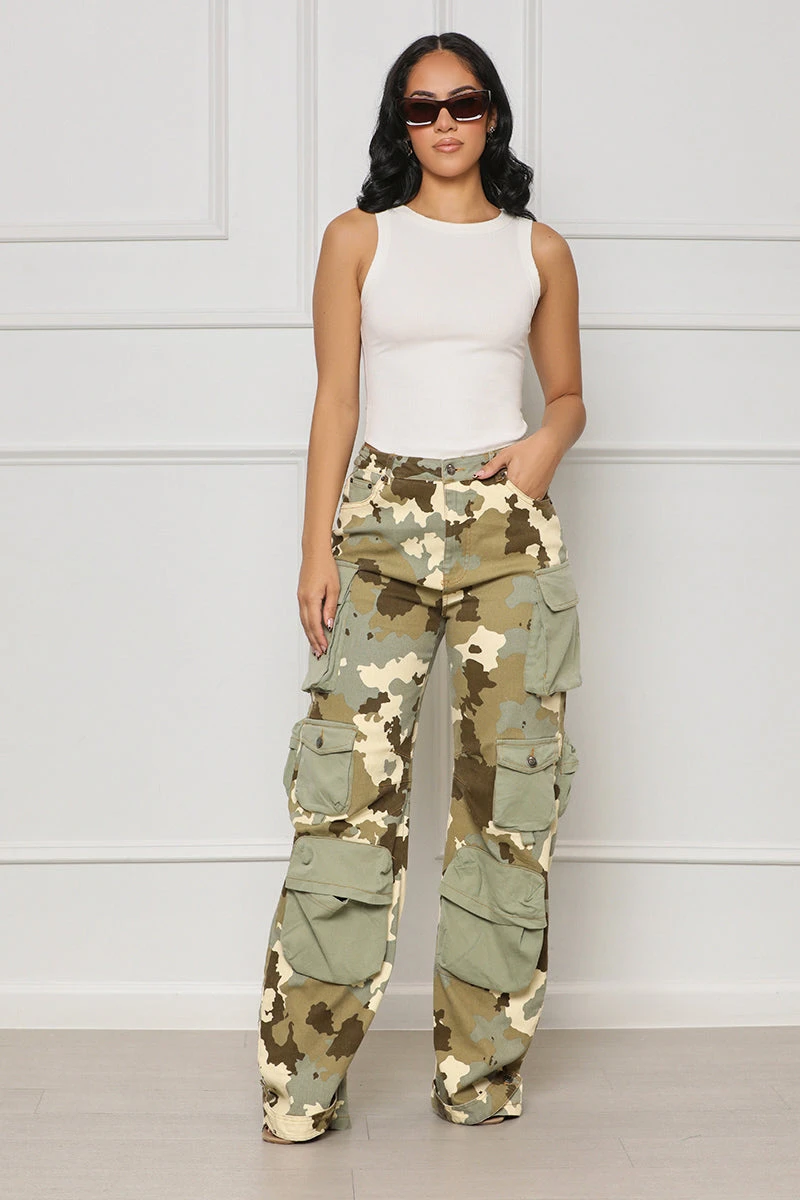 Be on trend with the Weekend Chaos Cargo Pants. These camouflage print pants feature a buttoned waistband with a stretchy feel, front zipper closure, multiple pockets for convenience, and adjustable straps on the hem for a personalized fit. Ideal for outdoor activities, these pants can also be worn casually. Style with a bodysuit or graphic tee to complete the look.